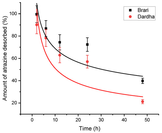 The curves show that atrazine desorbed faster from Brari clay than from Dardha clay. This was expected because, as shown above, Dardha clay better adsorbed atrazine, so consequently, its desorption would be slower. As can be seen from the curve, in the first two hours of clay-water solution of atrazine contact, 99.1% of atrazine was desorbed.