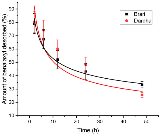 The data in Figure 5 present the desorbed amounts of benalaxyl from natural Brari and Dardha clays. From the curves obtained, we can see that the desorption process of benalaxyl from Brari clay was faster than for Dardha clay. It is worth noting that the desorption process is generally faster than the adsorption process, where this process is slower.