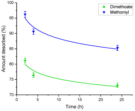Figure 6 graphically shows the desorption process of dimethoate and methomyl from natural Brari clay. The curves show that methomyl desorbed much faster than dimethoate from Brari clay. At the same time, the desorbed amount (in %) of methomyl was twice the amount of dimethoate desorbed from Brari clay under strictly the same conditions.