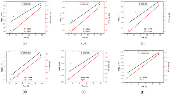 Figure 7a shows the desorption kinetics of atrazine (expressed %) at a concentration of 25 mg/L from natural Brari clay. The obtained curves show that we are dealing with a pseudo-second-order reaction with = 0.9523. The kinetics of pesticide desorption from clay is generally seen to be dominated by pseudo-second-order.
