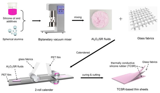 Figure 6 presents the preparation process of TCSR-based thin sheets. Raw materials such as spherical Al2O3, silicone oils, and additives were mixed homogenously to form Al2O3/SR fluids. The fluids were pressed into thin sheets on a double-roller calender, followed by heat curing to obtain solid thin sheets. The sheets were protected by two PET films (release films). Glass fabric was blended into the thin sheets for mechanical strengthening.