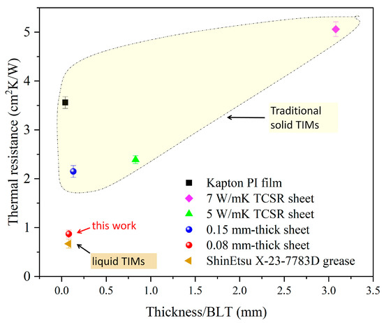 The test results are plotted against the TIMs’ thickness to understand the relationship between the thermal resistance and the thickness (Figure 4). It is shown that the liquid TIMs X-23-7783D has much lower thermal resistance (<1 cm2K/W) than the conventional solid TIMs (>2 cm2K/W) and the 0.15 mm-thick sheet, while the 0.08 mm-thick sheet prepared by the low-viscosity calendaring method has obtained a thermal resistance (0.87 cm2K/W) almost as low as that of X-23-7783D. This thermal resistance is also lower than many PI-based thermally conductive sheets in the open literature [18,19]. The low thermal resistance of the 0.08 mm-thick sheet can be mainly attributed to its small thickness.