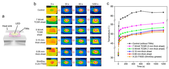 Due to the low thermal resistance, TCSR-based ultra-thin sheets can be used in thermal management applications. Here we evaluate its cooling performance on a homemade LED-based testing setup (Figure 5a). Comparison tests of a variety of TIMs were conducted. The infrared camera took infrared images at an ambient temperature of 30 °C. Figure 5b shows infrared images recording the working temperature on the LED chip. Figure 5c shows that the LED working temperature at 20 min was as high as 81.9 °C when there were no TIMs between the LED chip and the heat sink. When TIMs were placed between the LED chip and the heat sink, the LED working temperature decreased. The temperature was decreased to 51.7 °C when a 0.08 mm-thick sheet was used as the TIM. This cooling performance is comparable with that of ShinEtsu X-23-7783D thermally conductive grease and is better than that of the other solid TIMs tested. This is because the low thermal resistance of the 0.08 mm-thick sheet can effectively eliminate the intense heat generated by the LED.