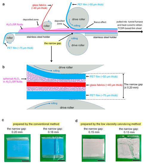 Figure 6c,d shows the effects of the optimization. Two Al2O3/SR fluids were prepared. One was prepared from the most typical raw materials in the industry and by the most conventional method used currently. The vinyl silicone oil had a viscosity of about 500 mPa·s at 25 °C, and the major thermally conductive filler was spherical alumina with a mean size of 20 μm. After the raw materials were mixed together, the resultant Al2O3/SR fluid had a viscosity of about 143 Pa·s. The fluids were calendered and heat-cured to obtain TCSR-based thin sheets. Various gap sizes were studied. The smallest gap that could obtain smooth sheets was 0.20 mm, and the obtained sheets had a thickness of about 0.15 mm (seeing Figure 2b inset). When the gap was decreased to 0.18 mm, the resultant sheets were deformed, as shown in Figure 6c.