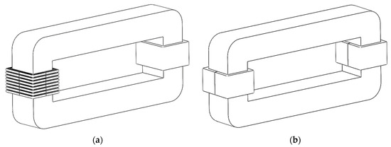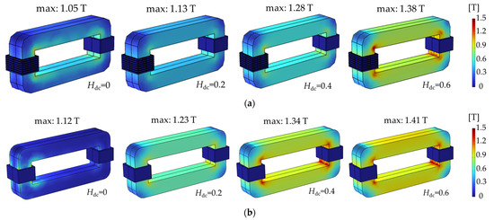 - Pfutzner, H.; Shilyashki, G.; Bengtsson, C. Effects of DC Bias on Regional Flux and Magnetostriction of A Single-Phase Transformer Core Modeled by 3-D MACC. IEEE Trans. Magn. 2018, 54, 1–6. [Google Scholar] [CrossRef]