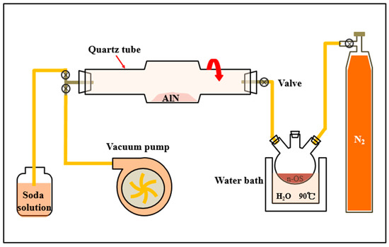 The schematic of obtaining the siloxane protective layer on AlN powder is shown in Figure 1. First, 100 g AlN powder was put into a rotating quartz tube and pumped to 10−9 Pa with a suit of vacuum systems. Then, the three-necked flask with 0, 0.2, 0.4, 0.6, 0.8, and 1.0 g octylatechlorosilane was heated to 90 °C in the water bath, and the validated octyltrichlorosilane was slowly filled into the quartz tube with dry nitrogen. When the pressure in the quartz tube was slightly higher than 1 atm, the exhaust valve was opened and the waste gas was vented into a 30 wt% sodium carbonate solution. After the octylatechlorosilane in the flask was completely volatilized, the quartz tube was washed with dry nitrogen for another 30 min. The obtained powder was modified AlN powder. AlN powder modified with different doses of octylatechlorosilane was labeled as M0, M1, M2, M3, M4, and M5, respectively. The AlN powder surface-modification device is shown in Figure 2.