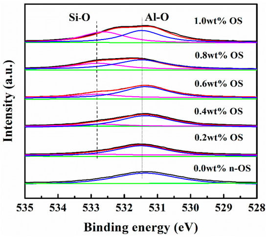 Meanwhile, the XPS spectra of various OS-modified AlN powders are displayed in Figure 3. The pristine AlN powder consisted of N, Al, and O elements; however, additional C and Si elements were found after modification. It is also obvious that the content of O, Al, and N elements gradually decreased, while the content of C and Si elements had a reverse tendency with increasing OS content (Table 3). Figure 4 shows the O1s of various OS-modified AlN powders. The peaks located at 531.4 and 532.8 eV were assigned to Al-O and Si-O, respectively [26,27] and the peaks centered at 532.8 eV increased as the increasing OS grafted on the surface of AlN powder. The chemistry of the modified AlN powder also verified that OS had successfully grafted on the surface of the AlN powder.