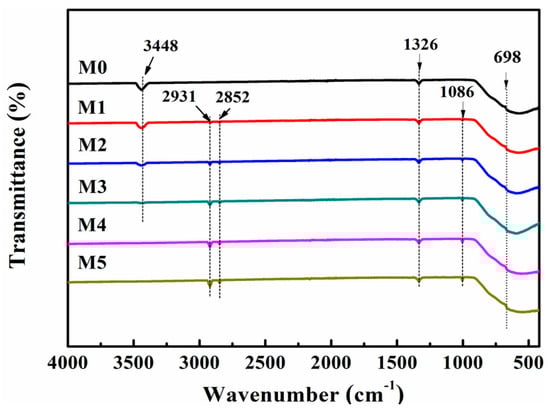 To further understand the surface structure of OS-modified AlN powder, Figure 5 displays the FTIR spectra of various OS-modified AlN powders. There were three absorption peaks located at 698 cm−1, 1326 cm−1, and 3448 cm−1. The peaks located at 698 cm−1 and 1326 cm−1 corresponded to the Al-N bond [28,29]; while the peak located at 3448 cm−1 was assigned to the O-H stretching vibration bond in the Al-OH compound [30]. After modification, new peaks located at 2931 cm−1 (-CH), 2852 cm−1 (-CH2), and 1103 cm−1(Al-O-Si) appeared [30,31]. The above results demonstrate that the OS grafted on the surface of AlN powder through the formation of the Al-O-Si bond.