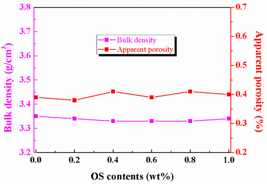 To investigate the effect of modified aluminum nitride powder on the microstructure and phase of aluminum nitride ceramics, Figure 8 displays the bulk density and apparent porosity of AlN ceramics prepared with modified AlN powder that had been stored for 1 year. It can be seen from the figure that although the content of octyltrichlorosilane grafted on the AlN powder surface increased, the AlN ceramics obtained based on the modified AlN powder had similar bulk density and apparent porosity. Their bulk densities reached 3.35, 3.34, 3.33, 3.33, 3.33, and 3.34 g/cm3, while their apparent porosities were 0.39, 0.38, 0.41, 0.39, 0.41, and 0.40%. These results indicated that the modified AlN powder had little influence on the porosity and bulk density of the AlN ceramics.