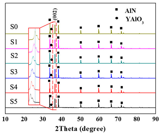 Figure 9 displays the microstructure of AlN ceramics prepared with modified AlN powder that had been stored for 1 year. As shown in Figure 9, there was little difference in the microstructure for AlN ceramics with various modified AlN powders. A small number of white grains were randomly located at the trigeminal grain boundaries of the gray grains. The EDS results showed that the gray grains only contained Al and N elements, and the atomic ratio was close to 1:1, which indicates that the gray grains were AlN, while the white grains were composed of Al, Y, and O elements, and the atomic ratio was close to 1:1:3, which is YAlO3. To further clarify the composition and content of these phases, Figure 10 shows the XRD of AlN ceramics prepared with modified AlN powder stored for 1 year. The results once again confirm that the phase composition of aluminum nitride ceramics is AlN and YAlO3, and the content of these two phases is almost the same. However, the peak of AlN located at the (002) plane gradually shifted to the left as more octyltrichlorosilane was grafted on the AlN powder surface. The change in lattice constants was closely related to the content of oxygen impurities in AlN ceramics. According to the Bragg diffraction formula, 2dsinθ = nλ, it can be deduced that as the content of octyltrichlorosilane grafted on the surface of AlN powder increased, the content of oxygen impurities dissolved in the AlN lattice reduced, and the interlayer space of the (002) plane became larger, leading to the peak shift to the left.