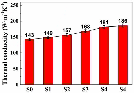 To further evaluate the effect of modified AlN powder on the thermal conductivity of AlN ceramics, Figure 11 displays the thermal conductivity of AlN ceramics prepared from modified AlN powder that had been stored for 1 year. The thermal conductivity of aluminum nitride ceramic based on the pristine AlN powder was only 143 W·m−1·K−1; however, with the increase of octyltrichlorosilane, the thermal conductivity of AlN ceramics reached 151, 157, 172, and 181 W·m−1·K−1. When the OS dosage reached 1.0 g, the thermal conductivity of aluminum nitride ceramics reached 186 W·m−1·K−1. The above results show that the siloxane protective layer grafted on the surface of the AlN powder was beneficial to improving the thermal conductivity of AlN ceramics.
