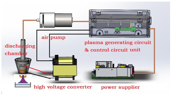 The cold plasma generator used in this study was self-developed and built by the Suzhou Amazing Grace Medical Equipment Co., Ltd., China [17]. Figure 1 shows the schematic diagram of the developed device. The device consists of major components, such as an air pump, a plasma generating circuit and control circuit unit, a high voltage converter, and a power supply. In addition, a discharging chamber is included in the device, which is important for generating plasma and is formed from an air tubing, metal deflector, insulated enclosure, positive and negative poles, and barrier medium. With the help of a metal deflector, the working gas (atmospheric air) has more contact area per unit time in the channel, thus, having higher ionization efficiency. In this study, the device was optimized at a frequency of 120 kHz and a fixed duty ratio of 50%, when the input voltage was adjusted to approximately 12.8 V with the circuit current at 2.5 ± 0.2 A. Considering the duty ratio, the power of the cold plasma generator could be estimated at approximately 2.5 A × 12.8 V × 50% = 16 W. Nonetheless, the air pump was set to 5.0 ± 0.5 L/min flow rate.