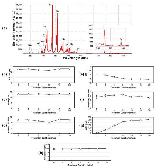 Figure 2. (a) Optical emission spectrum (OES) of cold plasma. Measurement of (b) current, (c) voltage, and (d) plasma dose of the in-house built cold plasma device at different treatment durations. Detection of (e) pH changes, (f) electrical conduction, and (g) oxidation-reduction potential (ORP) of the cold plasma-treated solution. Measurement of (h) cold plasma temperature from 0 min to 30 min.