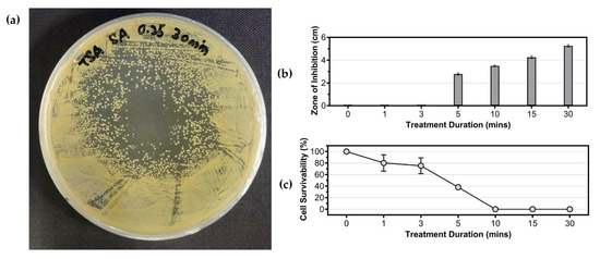 Figure 3. Effects of cold plasma treatment on the growth of Staphylococcus aureus ATCC 6538. (a) Example of inhibition zone formation on the S. aureus spread plate; (b) effect of cold plasma treatment duration on zone of inhibition formed on agar plates; (c) cell survivability of S. aureus in liquid suspension after treatment with cold plasma.