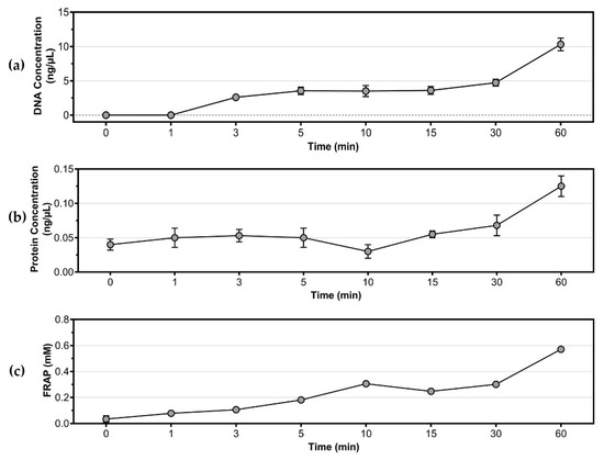 Figure 4. Detection of intracellular components and antioxidants in culture supernatant. (a) Concentration of DNA; (b) concentration of protein; (c) total antioxidant activities of S. aureus as determined by FRAP assay (equivalent to mM FeSO4).