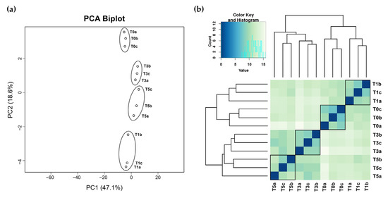 Figure 5a,b illustrates the biological replicate assessment of the RNA-sequencing data. The principal component analysis (PCA) plot in Figure 5a demonstrates that the three biological replicates of each treatment cluster close together, indicating high correlation among the replicates. Similarly, Figure 5b shows that the biological replicates from the same treatment tend to cluster together. Furthermore, when comparing across the four treatment groups, T0 and T1 form one cluster, while T3 and T5 form another, highlighting the high similarity within the two main clusters.