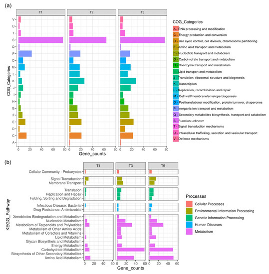 Figure 6a,b shows the DEG enrichment analysis based on Clusters of Orthologous Groups (COGs) and Kyoto Encyclopedia of Genes and Genomes (KEGG) that assign genes to different microbial cell processes. Out of 497 identified DEGs, 444 and 312 DEGs were successfully assigned to COG categories and KO numbers, respectively. According to COGs classification (Figure 6a), the most affected DEGs after cold plasma treatment (T1, T3, and T5) were primarily categorized as “function unknown” (S), followed by biological processes of “inorganic ion transport and metabolism” (P), “transcription” (K), “energy production and conversion” (C), “amino acid transport and metabolism” (E), “cell wall/membrane/envelope biogenesis” (M), and “translation, ribosomal structures and biogenesis” (J).