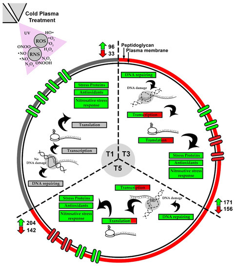 In this study, 20 DEGs related to DNA repairing were identified. None of them were up- or downregulated in T1, but most of them were upregulated in T3 (20 genes) and T5 (17 genes). This difference is because the cold plasma had not yet caused damage to the bacterial intracellular DNA in the early treatment (T1); therefore, none of the genes were identified as DEGs in T1, please refer to (d) in Table 2. However, in the prolonged treatment (T3 and T5), the accumulative ROS, RNS, and other energized molecules and atoms surrounded the bacterial cells, damaging the DNA in the cells and triggering the respective repairing mechanisms.