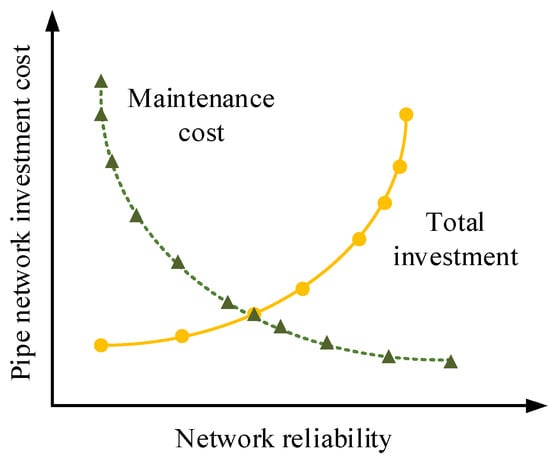 In Equation (10), represents each pipe section’s water flow rate in the water supply network; refers to the limited maximum flow velocity of each pipe section in the RWSN. When the water flow in the pipeline is too fast, it may cause the possibility of a pipe explosion. Therefore, in the process of water supply, the water flow speed must be strictly controlled to avoid the pipe network’s burst rate. The pipe network’s reliability can be described as reducing the pipe burst rate of the pipe network as much as possible under the basic premise of meeting the user’s water consumption. However, even after the pipe explosion accident, the water supply and demand can still be guaranteed to meet the user’s water demand. Figure 1 shows the relationship between investment cost and the reliability of the pipeline network [24].