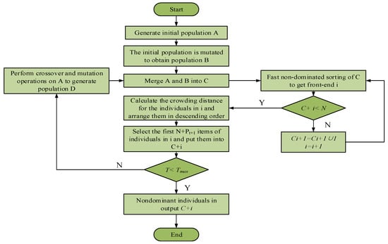 LM is applied to solve the nonlinear equations composed of constraint conditions. In the calculation process, it is necessary to assume an initial value of pipe diameter. If the initial value setting is not ideal, the equations may be misunderstood, or it may be tough to find the best solution. Therefore, it is required to test the closure of the equations. When the equations are not closed, an infeasible solution can be given to the equations in the NSGA-II algorithm. After the argument is regenerated, skip this generation directly and solve it again. When the initial value meets the constraint conditions (1)–(3), the previously set pipe diameter will be further reduced, and the calculation and judgment will be performed again. If the pipe diameter can still meet the constraint conditions, reduce the pipe diameter again until the constraint conditions cannot be met. The NSGA-II algorithm improves the convergence speed of the whole model by quickly ranking the individuals of the population. The concepts of fast non-dominated sorting and crowding distance are applied in the NSGA-II algorithm, which can enhance the diversity of the population to a certain extent to avoid falling into local optimum. At present, the NSGA-II algorithm has become an excellent algorithm for solving multi-objective optimization issues [28].