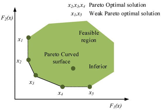 The optimal solution-solving problem in multi-objective optimization is aimed at the set composed of all optimal solutions, that is, the non-inferior optimal solution set. Figure 3 shows the Pareto curve in front of the non-inferior solution under two objective functions.