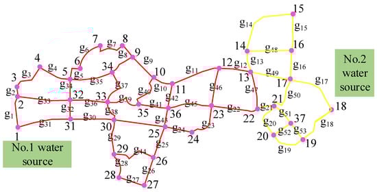 This study selected the water supply network of a town as the research object. The total water supply scale of the town’s water supply network is 20,000 m3. The water supply network system uses two water plants as water sources, and there are 36 nodes and 53 pipe sections in the network. The overall pipe network layout is shown in Figure 4 below.
