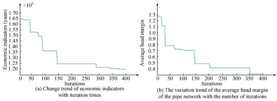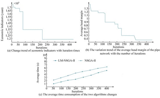 Figure 7 illustrates the rural water supply pipeline optimization process combining the LM algorithm and NSGA-II algorithm. From Figure 7a,b when the iterations achieve about 210 generations, the RWSN’s economy is optimal; When the iterations achieve about 325 generations, the RWSN’s average head margin of the nodes is the best, that is, the RWSN’s reliability is the best at this time. From Figure 7c, the NSGA-II combined with LM takes less time at this time. Thus, the validity of the LM algorithm and the feasibility of NSGA-II for solving the optimization model of RWSN are verified. Subsequently, the experimental results shown in Table 1 can be obtained by calculating the hydraulic power of the water supply network through Equations (1)–(3) and (10)–(12).