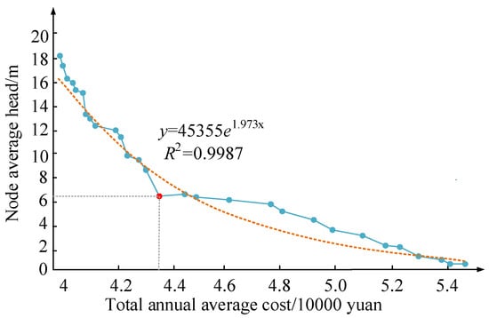 The orange line in the figure represents the trend line of change, and the blue line represents the specific change between the average head of water supply network nodes and the annual cost of the network. From Figure 6, the average head of water supply network nodes is inversely proportional to the annual cost of the network. The node average head decreases with the increase in the annual cost. Therefore, both the reliability and economy of RWSN should be taken into consideration. As for the optimal solution selection, the annual cost of the water supply network should be as low as possible, and the reliability of the network should be as high as possible. By observing the above figure, we can choose the best point (4.38, 6.02). That is, the annual cost is CNY 438,000, and the average head of the pipe network node is 6.02 m. This point also ensures the economy and reliability of the pipe network.