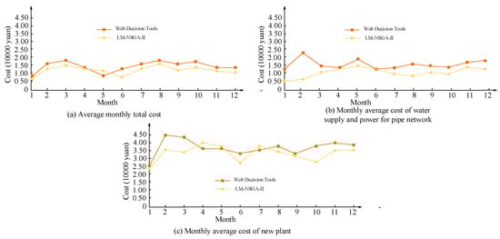 Figure 8 above shows the optimization results of the water supply network based on the Web decision-making tool in the literature [9] and the LM-NSGA-II algorithm [9]. This study will compare the solution results of water supply networks based on two methods. As shown in Figure 8, the optimal control results of water supply networks based on the LM-NSGA-II algorithm show that in terms of the cost of new water plants, the cost of the LM-NSGA-II algorithm is slightly higher than the cost of Web decision-making tools. In terms of the monthly average cost and the monthly average total cost of water supply power in the pipeline network, the cost of the LM-NSGA-II algorithm is lower than that of the Web decision-making tool. Overall, the LM-NSGA-II algorithm proposed in this study for optimizing water supply networks requires lower costs. The reliability research results of the water supply network are shown in Table 2.