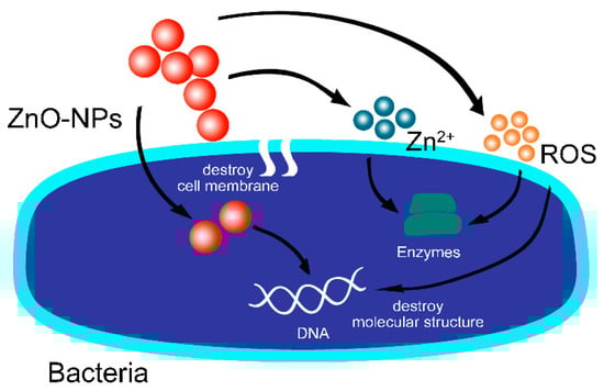 Zinc oxide nanoparticles (ZnO-NPs) are one of the metal oxide nanomaterials and a valuable and versatile inorganic compound due to its unique physical and chemical characteristics. They possess high chemical stability, a broadened radiation absorption spectrum, high electrochemical coupling coefficient, and high photostability with the molecular formula ZnO []. ZnO-NPs have been widely manufactured and utilized in various commercial and additive products, including ceramics, cement, plastics, glass, ointments, lubricants, adhesives, sealants, pigments, batteries, ferrites, fire retardants, cosmetics, and sunscreens, as well as in foods as a source of zinc nutrient [,]. Nanosized ZnO particles demonstrate significant antibacterial capabilities due to their small size, which can stimulate different bactericidal mechanisms once inside the bacterial cell, including the bacterial surface or bacterial core, generate ROS (reactive oxygen species), release Zn2+, and even be endocytosed by cells. (Figure 1) [,,].