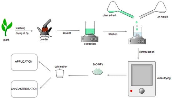 Plant-mediated synthesis. An interesting alternative to traditional chemical approaches is the production of ZnO-NP using plants and plant extracts []. The use of plants and plant extracts is an appealing, innovative, and safe method choice. A typical ZnO-NP production process is given in Figure 3, which avoids the use of harmful and hazardous substances [,]. For the synthesis of ZnO-NPs, we have a variety of plants and processes at our disposal. We will talk about the most popular, accessible, and simple synthesis methods in this section. Tomato fruits, chamomile flowers, and olive leaves were rinsed with double-distilled water and then allowed to air-dry. 200 mL of water was extracted for 4 h at 60–70 °C from powdered ground leaves, flowers, and fruits. Afterwards, the extracts were cooled to room temperature and filtered by filter paper. The collected plant extracts and ZnO were then mixed in a separate flask for the synthesis of ZnO-NPs. The mixture was stirred for 4 h at 100 rpm under the heating condition. The reaction solution was centrifuged at 10,000× g for 20 min, the supernatant was discarded, and the precipitation was collected. The precipitate obtained was washed with distilled water and freeze-dried to obtain ZnO NP [,].
