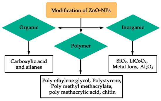A product can be modified to modify certain characteristics such as size, structure, morphology, colour, hardness, softness, and strength. The modification might improve the compatibility of ZnO-NPs with organic (carboxylic acid, silanes), inorganic (metal oxides), and polymers, etc., (Figure 5), which could improve ZnO-NP performance characteristics, such as consumable time, life cycle, optical properties, and also make it more beneficial to obtain more benefits and significantly reduce defects [,,,]. Thus, various potential modification techniques stated in the publications of ZnO-NPs are included in this section as follows.