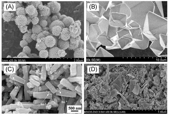 Scanning electron microscopy (SEM) morphology of ZnO nanoparticles (A) spherical ZnO, (B) bicone ZnO, (C) hexagonal sectional ZnO, (D) ZnO plates [].