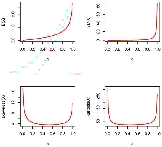 For the moments, symbolic software such as Maple was used. On the basis of the PMF and the law of mathematical expectation, the moments were derived in closed forms. Variance, skewness, and kurtosis can also be derived in closed forms: , , and . Figure 2 shows descriptive statistics of the proposed model on the basis of various values of the distribution parameter.