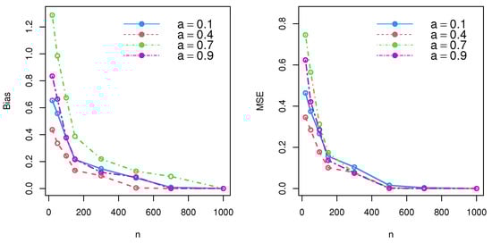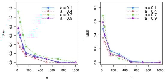 According to the simulation results and performance of , the MSE and bias decreased, and an unbiased estimator was thereby achieved for large samples under consistency. Thus, both the maximal likelihood approach and method of moments could be used to effectively estimate model parameters.