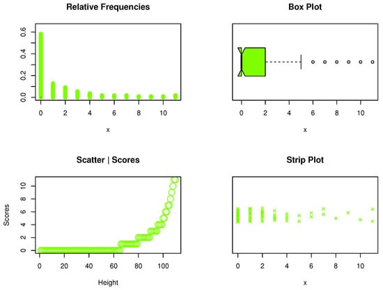 The kidney dysmorphogenetic dataset was taken from the study of Chan et al. [30]. It was discussed and analyzed by several authors in the statistical literature; for more details, see citations on Google Scholar for Chan et al. (2010). The data are: 0, 1, 0, 0, 3, 2, 0, 1, 0, 4, 0, 0, 1, 0, 3, 0, 0, 0, 2, 0, 1, 0, 0, 0, 1, 8, 2, 3, 0, 5, 0, 0, 0, 0, 7, 0, 10, 0, 0, 1, 0, 0, 0, 2, 11, 0, 6, 0, 0, 1, 0, 8, 0, 0, 7, 0, 1, 2, 0, 4, 0, 0, 0, 0, 1, 0, 9, 3, 0, 0, 0, 6, 2, 0, 1, 0, 2, 0, 4, 0, 11, 0, 0, 2, 0, 4, 0, 1, 3, 0, 0, 2, 0, 0, 5, 0, 1, 0, 0, 0, 0, 0, 2, 1, 0, 3, 0, 0, 0, 0, 1. The raw shape of kidney dysmorphogenetic data was explored using nonparametric sketches: relative frequency visualization, box plot, score diagrams, and strip representation. According to the previous nonparametric plots, kidney dysmorphogenetic data were not symmetric, and some extreme values were reported (see, Figure 5).
