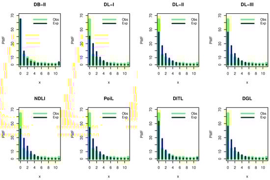 In this section, we illustrate the flexibility of the DWPLT model by using real medical data. Here, we examine the fitting capability of the DWPLT distribution with other competitive distributions, namely, geometric (Geo), discrete Rayleigh (DR) (see Roy [2]), discrete inverse Rayleigh (DIR), (see Hussain and Ahmad [8]), discrete Bilal (DBL; see Altun et al. [21]), Poisson (Poi; see Poisson [22]), discrete Pareto (DPa; see Krishna and Pundir [3]), one-parameter discrete flexible (DF-I; see Eliwa and El-Morshedy [23]), discrete log-logistic (DLogL; see Para and Jan [24]), discrete inverse Weibull (DIW; see Jazi et al. [5]), discrete Lomax (DLo; see Para and Jan [25]), binomial (Bin), discrete Burr Type II (DB-II; see Para and Jan [25]), one-parameter discrete Lindley (DL-I), two-parameter discrete Lindley (DL-II), three-parameter discrete Lindley (DL-III), Poisson Lindley (PoiL; see Shanker and Mishra [26]), natural discrete Lindley (NDL; see Almazah et al. [27]), discrete inverted Topp-Leone (DITL; see Eldeeb et al. [28]), and discrete gamma Lindley (DGL; see El-Morshedy et al. [29]) distributions. The fitted models were compared using the criteria of negative maximized log-likelihood (), Akaike information criterion (Ac), corrected Akaike information criterion (CAc), Hannan–Quinn information criterion (Hc), Bayesian information criterion (Bc), and the chi-squared (Chi) test with its corresponding P-value (Pv) based on the degree of freedom (Dm). The Ac is a mathematical approach for evaluating and discussing the suitability of a distribution for the real data from which it was generated. In statistics, the Ac is applied to compare different possible distributions and models, and to select the most appropriate distribution/model for the data. The standard correction of Akaike’s information criterion assumes the same predictors for training and validation, thus underestimating the prediction error of random predictors. The CAc was derived for regression models containing a mixture of random and fixed predictors. Both Ac and CAc are estimators of the prediction error and thus the relative quality of statistical distributions for a given set of real data. The Hc is a measure of the suitability of statistical distribution that is often applied as a criterion for distribution selection among a limited set of models; it is not based on the log-likelihood function, but is related to the Ac. The Hc is an alternative to Ac in some positions in practical fields. In statistics, the Bc or Schwarz information criterion is for distribution selection among a finite set of distributions where models with a lower Bc are generally preferred. It is partly based on the probability function and is closely related to the Ac. When fitting distributions, it is possible to increase the probability by adding parameters, but this may result in overfitting. Bc, Ac, and CAc try to solve this problem by proposing a partial term for the number of parameters in the distribution. The penalty duration is greater in Bc than that in Ac for samples larger than 7. Bc was derived and developed by Gideon E. Schwarz. who provided a Bayesian argument for its adoption. Lastly, chi-squared is a statistical suitability test utilized to determine whether a variable is likely to have come from a specified distribution. It is often applied to assess whether sample data are representative of the entire population. The chi-squared quality-of-fit test, in other words, is a kind of Pearson chi-squared test. Statisticians can apply it to test whether the observed distribution of a categorical variable differs from their expectations.