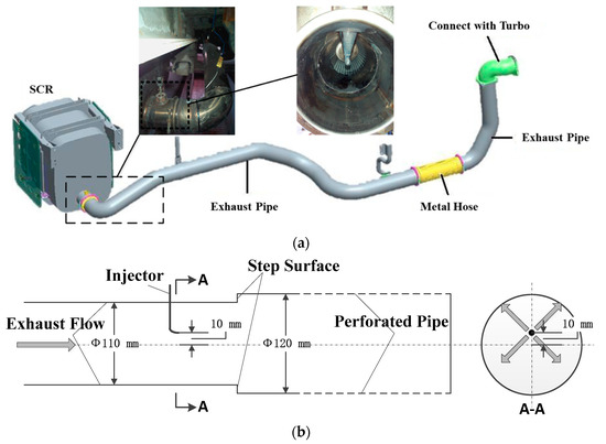 Diesel engine exhaust after-treatment system layout. (a) Arrangement and assembly of SCR system, (b) Sketch map of nozzle position and step surface.