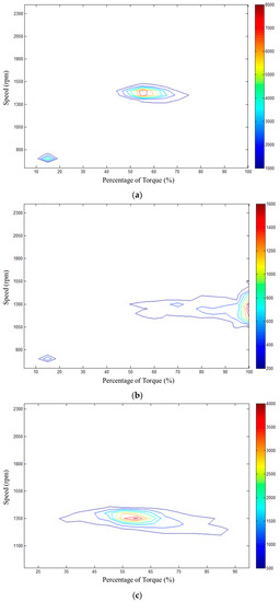 According to the vehicle real road test, the data of three groups were collected and used to indicate the operating conditions distribution of the employed commercial vehicle, as shown in Figure 5. A representative operating condition with the highest probability of occurrence was selected for the following simulation work.