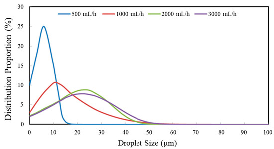 As shown in Figure 6, the LSA-III laser particle size tester was used to measure the droplet size of the urea nozzle. Due to the symmetrical distribution of the four holes of the urea nozzle, only one of the holes was measured. The droplet size distribution of different urea injection rates is shown in Figure 7.