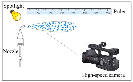 As shown in Figure 8, the high-speed photographic test measured the urea nozzle’s droplet initial velocity and atomization cone angle. It can take 1000 pictures per second by setting the frequency of the high-speed camera to 1000 frames. Based on the beginning of the spray, the droplet’s initial velocity was obtained by measuring the spray penetration distance in 1 ms. The atomization cone angle was measured directly from the spray geometrical morphology. Table 3 shows different urea injection rates’ droplet initial velocity and atomization cone angle.