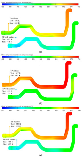 Figure 11 shows the comparison results between the simulation and test of exhaust temperature and pipe wall temperature under the three typical operating conditions. The results indicate that the difference between the simulation and test values was within 5 °C under each typical operating condition.