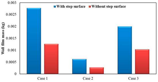 Figure 14 shows the influence of exhaust pipe with or without step surface on wall film mass. As can be seen, by the figure below, the wall film mass was lighter when the exhaust pipe had no step surface. Compared to the case with a step surface, wall film mass was reduced by about 54.44%, 55.40% and 48.27% for each operating condition, respectively, in the exhaust pipe without a step surface.
