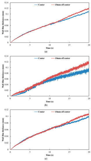 Influence of different nozzle positions on wall film thickness. (a) Case 1; (b) Case 2; (c) Case 3.