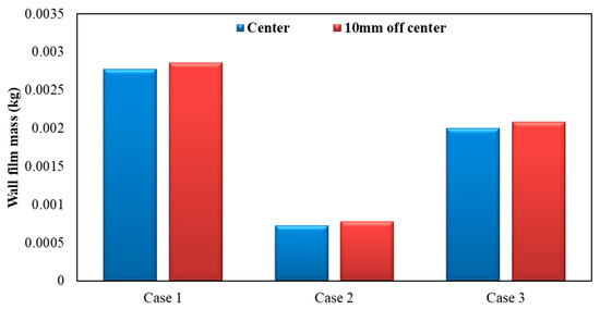 Figure 17 shows the influence of different nozzle positions on wall film mass. As can be seen, by the figure below, the wall film mass was lighter when the nozzle orifices were located in the center axis of the exhaust pipe. Compared to the case where the nozzle orifices are located 10 mm off the center axis, wall film mass was reduced by about 2.83%, 6.38% and 3.87% for each operating condition, respectively, when the nozzle orifices located in the center axis of the exhaust pipe.