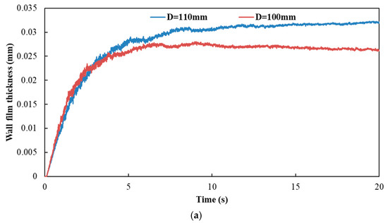 Influence of different exhaust pipe diameters on wall film thickness. (a) Case 1; (b) Case 2; (c) Case 3.