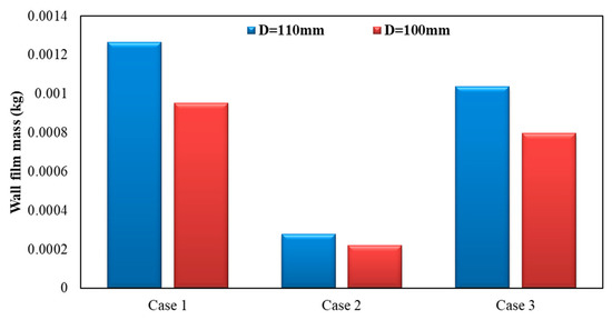 Figure 20 shows the influence of different exhaust pipe diameters on wall film mass. As can be seen, by the figure below, the wall film mass was lighter when the exhaust pipe diameter was 100 mm. Compared to the case of 110 mm, wall film mass was reduced by about 24.72%, 21.30% and 23.14% for each operating condition, respectively, when the exhaust pipe diameter was 100 mm.