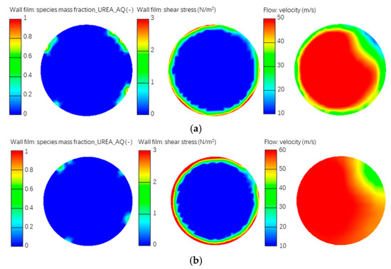 Figure 21 shows the distribution of wall film, shear stress and flow field velocity at the section of step surface in the exhaust pipe. After optimization, the region of wall film formed on the exhaust pipe wall became smaller, the shear stress on the wall film was significantly increased, and the flow field velocity nearby the wall surface increased by 20 m/s on average, which helped promote spalling, flow, and evaporation of wall film.