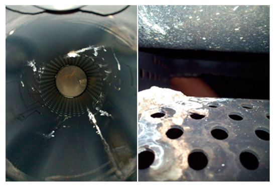 Another supplementary vehicle real road test was conducted to verify the effectiveness of the optimization scheme. It was found that a small number of deposits formed on the perforated pipe at the entrance of the catalytic converter, as shown in Figure 22.