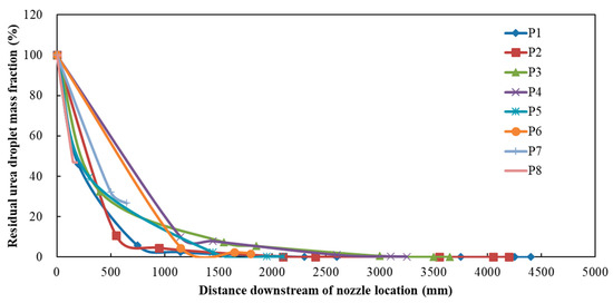Part of the urea droplets sprayed into the exhaust pipe is heated to evaporation and become gas, and another part attaches to the exhaust pipe wall to form wall films. The rest part of the unevaporated urea droplets keeps moving with the exhaust flow. Figure 23 shows the change in residual urea droplet mass fraction with the distance downstream of the nozzle location. The results indicated that there was almost no residue of urea droplet at the distance 10D downstream of the nozzle location (D was the exhaust pipe diameter of 110 mm). Therefore, the nozzle location should be arranged at least 10D upstream of the perforated pipe to eliminate the hidden trouble of deposit formation inside the catalytic converter.